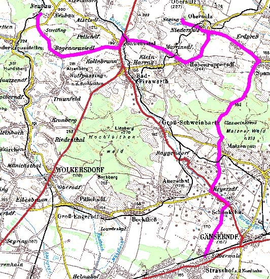 Mit der Schnellbahn z.B. nach Neubau/Kreuzstetten, von da über Bogenneusiedl und Gaweinstal nach Hohenruppersdorf, 5 km nördlich liegt Niedersulz. Nach Stillen des Kultur- und sonstigen Hungers geht's weiter über Spannberg nach Matzen und ab Schönkirchen auf asphaltierten Güterwegen nach Silberwald - wo wieder die Schnellbahn bestiegen werden kann.