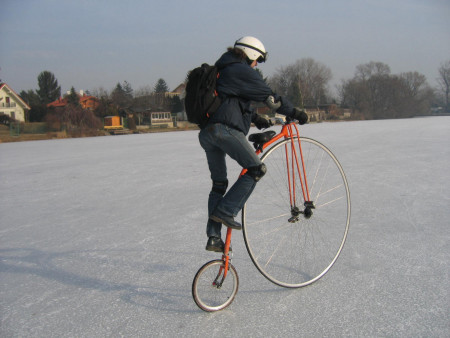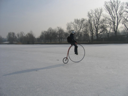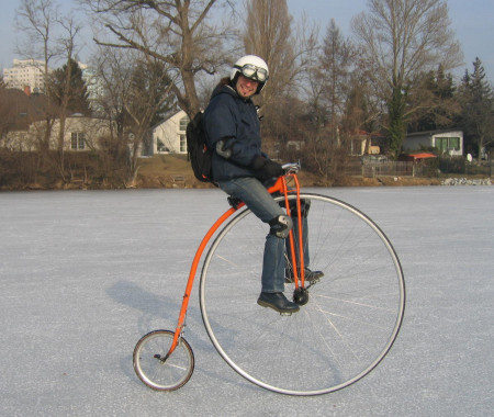 An einem dieser Tage sah ich im Licht der aufgehenden Sonne einen Radfahrer über die Alte Donau strampeln; angetan nicht nur nur vom Umstand mit dem Rad auf Eis zu fahren sondern auch wie der gute Mann bei seiner Querung vom Neu-Brasilien bis zur Alten Kaisermühle, ein gutes Stück weg abzuschneiden, beschloss ich es ihm gleichzutun - allerdings auf dem Hochrad!