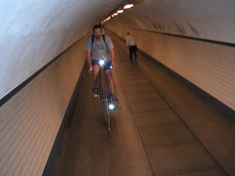 Jetzt macht sich der Reiseführer bezahlt. Ganz in der Nähe soll sich ein Fußgängertunnel befinden, durch den man das Rad aber nur schieben darf. Entweder ist die Info aus dem Reiseführer veraltet, oder keiner schert sich drum: Obwohl wir mit dem Kopf fast an der Decke anstreifen, fahren wir wie alle anderen durch den etliche 100 Meter langen Tunnel.