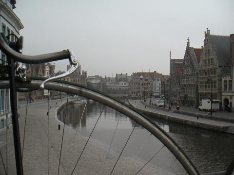 In Gent hat es sich inzwischen eingetrübt. Am Bahnhof, wo wir unsere Rückfahrkarten kaufen, zeigt man uns einen Zeitungsartikel von der heute beginnenden Hochrad WM und empfiehlt uns, entlang der zu einem Kanal ausgebauten Leie nach Roeselare zu radeln. Ein wirklich guter Tip.
