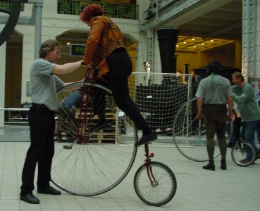 Wir - das waren Rossi, HAE und Georg - erfreuten die anwesenden Besucher mit einer kleinen Vorführung über das Hochradfahren. Rossi und HAE waren erstmals in Knickerbocker erschienen, um dem historischen Umfeld ein wenig Rechnung zu tragen.