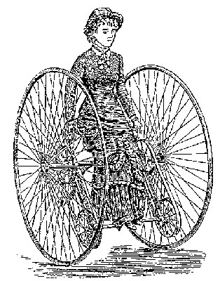 Auf den ersten Blick, besonders wenn ein Fahrer oder eine Fahrerin auf ihm sitzt und den Mechanismus verdeckt, möchte man es als ein Dreirad mit mittelbarer Hintersteuerung, also mit kleinem Hinterrad, halten, es hat aber nur zwei gleichgroße Räder, welche nicht hinter- sondern nebeneinander sich um eine gemeinsame Achse drehen und ihren Antrieb von einer gesondert gelagerten gekröpften Welle erhalten. Der Sitz befindet sich zwischen den beiden Rädern über der Achse. Die Lenkbarkeit des sonderbaren Fahrzeugs wird durch eine sehr sinnreiche Einrichtung bewirkt. Die Übertragung der drehenden Bewegung der Trittwelle auf die Räder erfolgt durch dünne Stahlbänder und diese laufen über Riemenscheiben, deren äußerer Rand zur Vermehrung der Reibung eine Gummieinlage erhalten hat. Die zwei Eisenstangen, an welchen die LAger der Trittwelle befestigt sind, sind mit der Hauptachse nicht fest verbunden, sondern in zwei röhrenfömigen Führungen derart beweglich, daß der Raum zwischen den auf der Trittwelle befindlichen Riemenscheiben und den mit den Triebrädern verbundenen vergrößert oder verkleinert werden kann. Durch Drehen der zu beiden Seiten des Sitzes angebrachten Handgriffe nach auswärts kann nun jede der unteren Riemenscheiben unabhängig von der anderen der Hauptachse genähert werden, do da&azlig; das betreffende Stahlband locker wird und der Zusammenhang zwischen dem Triebrad und der Triebwelle aufhört. Denkt man sich z.B. den rechts befindlichen Handgriff nach außen gedreht, so hört der Zusammenhang zwischen dem rechten Triebrad und der Triebwelle auf und ersteres erhält keinen Antrieb mehr, während das linke Triebrad noch in Drehung versetzt wird; die Folge davon ist ein Rechtslaufen des Fahrzeugs. Läßt man jetzt noch die Bremse auf das rechte Triebrad einwirken, so kann man in einem Kreise fahren, dessen Halbmesser nicht größer als der Radstand des Vehikels ist. Die Bremsvorrichtung ist gleichfalls für jedes Rad besonders angebracht und die betreffenden Handgriffe befinden sich in den Handgriffen zum Verstellen der Trittwelle, so daß sie mit den Zeigefingern zu erreichen und in Wirksamkeit zu bringen sind.