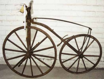 Überreste eines Lenz-Vélocipède mit Resten der ursprünglichen Bemalung. Insgesamt finden sich drei Fassungen: Die erste, älteste Schicht ist orangerot, dann folgten Schwarz, Hellblau und Rosa, zuletzt wurde das Vélocipède in blau, wieß und rot, den Farben der französischen Trikolore, bemalt. Priginalfarben an Vélocipèden sind sehr selten und sollten so weit wie möglich bewahrt werden.