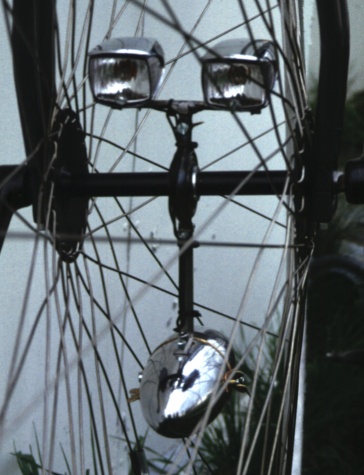 Eine auffällige und schöne Lösung ist dieses batteriebetriebene Licht im Vorderrad! Es hängt kugelgelagert an der Nabe und wird durch