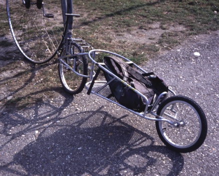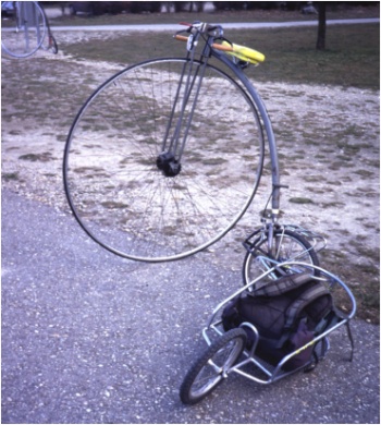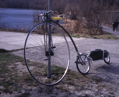 Der besondere Gag! Dieses Hochrad braucht nicht angelehnt zu werden. Der einspurige Anhänger dient gleichzeitig als Hochrad-ständer!