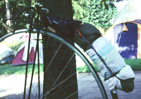 Ein idealer Platz für Gepäck ist entlang des Rahmenrohres ("back bone") am Sattel hängend. In diesem Fall findet ein 3-Personen Zelt problemlos Platz - und beeinflußt nur kaum die Fahreigenschaften.