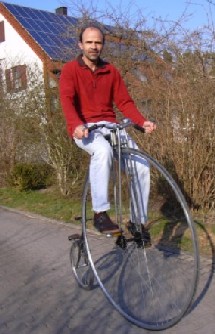 "Jürgen": Der Sozialpädagoge bastelt gerne und ist nun nicht nur stolz auf seine selbst installierten Solarbrauchwasser- und Solarstromanlagen sondern auch auch auf das in Wien gebaute Hochrad, das jetzt in der Nähe von Nürnberg fahren darf. Dank an HAE un Rossi und insbesonders Georg für seine unkomplizierte und nette Gastfreunschaft! |