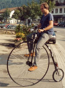 "Thosi": Der Werbefotograf und Liegerad-Fan aus Heilbronn (nördlich von Stuttgart)hat nach der Froschperspektive auf dem Liegerad jetzt das souveräne Dahingleiten zwei Stockwerke höher mit Hilfe Rossis "altem" Hochrad entdeckt. |