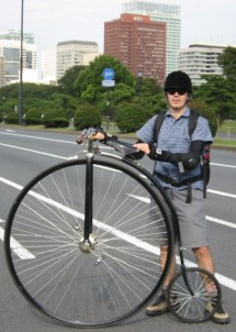 "Nan-da Sore wa!": ("Was zur Hölle war das!" auf japanisch) Chris, seit langem in Tokyo ansässig, erregt mit seinem Hochrad einiges Aufsehen seit er es vom Captain der Oamaru Cycle Works in Neuseeland erhalten hat. |
