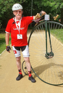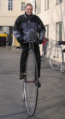 "Robi": baute sich das größte bisher im Selbstbau in Wien entstandene Hochrad (56") und wird damit sicherlich viel herumtouren. |