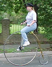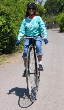 "West Coast Wheelwoman": Da Mike jetzt schon vier Hochräder hat, muß Susie auch damit fahren - aber offensichtlich gefällt es ihr. |