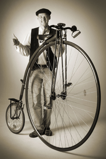 "Thosi": Der Werbefotograf und Liegerad-Fan aus Heilbronn (nördlich von Stuttgart)hat nach der Froschperspektive auf dem Liegerad jetzt das souveräne Dahingleiten zwei Stockwerke höher mit Hilfe Rossis "altem" Hochrad entdeckt. |